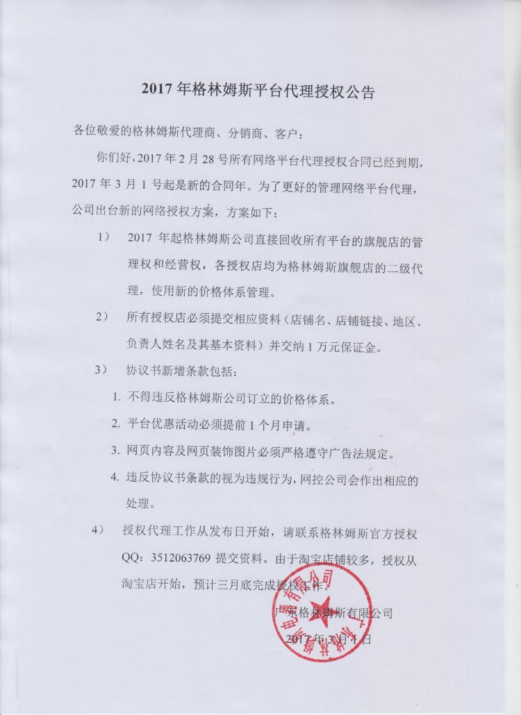 2017年格林姆斯平台代理授权公告