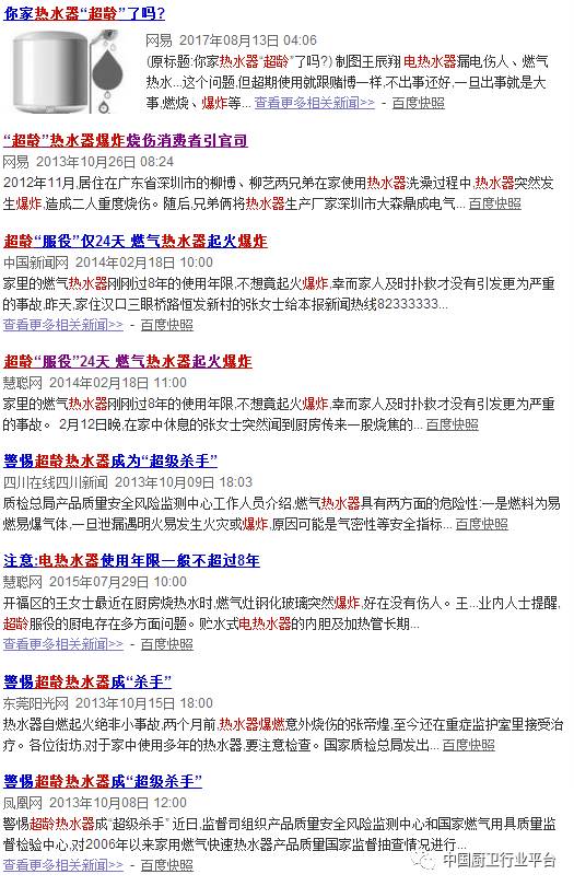 “国家标准明确规定,从售出当日起,使用人工煤气的快速热水器的判废年限应为6年,使用液化石油气和天然气的快速热水器的判废年限应为8年。”国家质检总局产品质量监督司相关负责人表示,消费者不知道或不重视燃气热水器使用寿命,使得燃气热水器超期服役情况大量存在。据国家燃气用具质量监督检验中心专家介绍,超年限使用燃气热水器,可能会出现4个安全隐患:一是热水器热效率降低,耗气量提高;二是热水器结垢严重,换热速度减慢,还可能导致爆炸;三是燃烧器结灰,喷嘴堵塞,不易打火,易引发燃烧不完全,一氧化碳中毒事故;四是安全装置老化失效,存在燃气泄漏爆炸及烫伤等隐患。